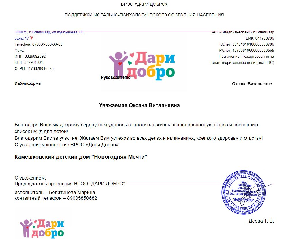В преддверии новогодних праздников ВРОО «ДАРИ ДОБРО» проводила благотворительную акцию для Камешковского детского дома. Мы стали спонсором этого мероприятия. Теперь в детском доме есть современное оборудование, посуда и мебель, а также большой запас гигиенических принадлежностей.